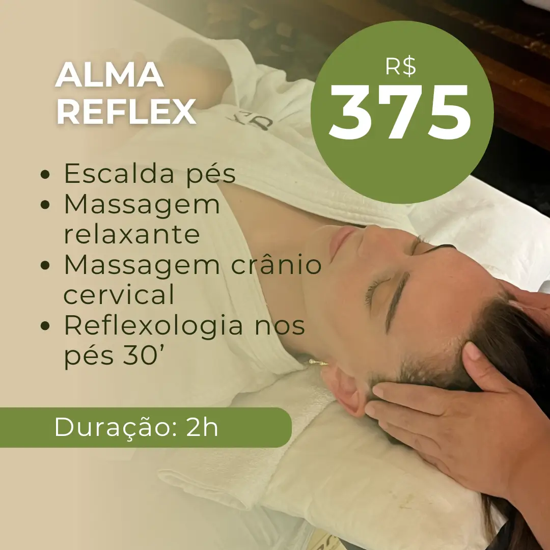 Com 2 horas de duração, o Alma Reflex é a escolha ideal para quem deseja cuidar do corpo e da mente de forma completa e consciente, por R$375.